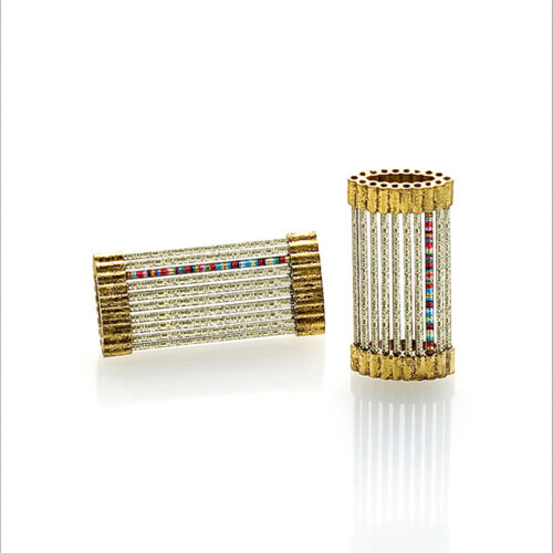 Silver discs are a favorite of Nazan Pak. Her Dot Earrings have 3 enamel covered, silver discs in varying sizes. The textured alternating lime yellow, grey blue and white enamel pieces are attached with oxidized silver beams. These handmade earrings dangle freely thanks to their rivets.