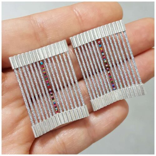 JW: I personally cut, sand, and solder all of the jewelry in my studio from design to finish. The most important technique is the process of adding color to the metal. Combining the two materials of metal and thread, which are of contrasting properties, is a critical step. It consists of hand-wrapping the metal surface with thread, thus adding color to create harmony of color as well as balancing power and malleability within the restrained precise lines.